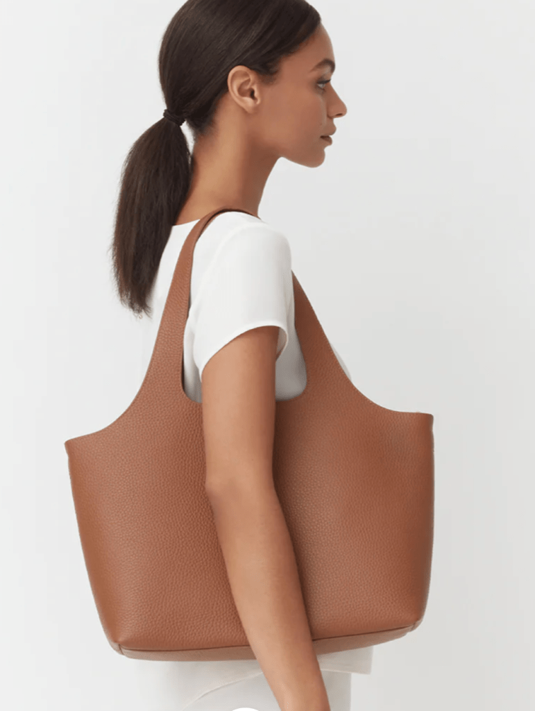 Brown leather toteTotes are indispensable accessories for the modern woman, offering both style and functionality in one versatile package. I truly love seeing the many ways woman rock this bag style on their day to day commute. Talk about a bag that goes with everything and elevates every look, specially work outfits. When you take a high-quality leather bag – which by the way does not need to be overly expensive – you will have your look taken to the next level. Trust me. I also love the timelessness of these bags too (a good one can stay in great shape for years). This accessory exudes sophistication and durability in equal measure. Its rich brown hue adds warmth and versatility, seamlessly complementing an array of outfits from casual to formal. Images below are links to the references (they come in multiple colors as well!)