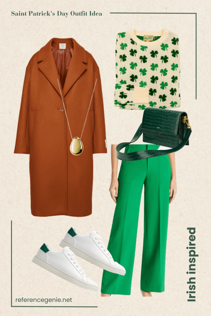 4. **Irish-Inspired Patterns** Show off your love for the Emerald Isle with Irish-inspired patterns like plaid or Celtic knots. In this look we have a patterned sweater in tones of green – it would go well with this wool coat in burn orange and gold jewellery for extra spark. Top the look with a nice pair of bold green trousers and a leather bag.