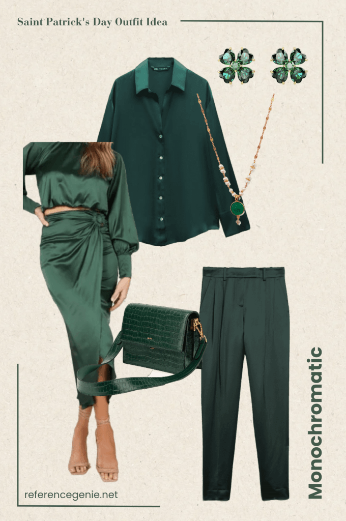 5. **Monochromatic outfit goals** We are going for sophistication, elevated look in this one. This monochromatic inspired Irish look brings emerald green as its staple. We have two different options in here, both with satin material, adding flair and luxury into the mix. We topped the look with these beautiful pair of Swarovski earrings and necklace that will elevate the overall ensemble.