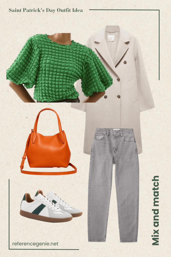 3. **Mix and Match** Get creative with your outfit by mixing different shades of green with other colors. Try pairing a bold green top with neutral bottoms or mixing prints for a playful ensemble that stands out from the crowd. In this look inspo we first picked this insanely beautiful top from Antrophologie and built the look from there. We are going for Irish flag here – orange bag, oat/cream wool coat, white sneakers with a splash of green and a nice neutral pair of jeans. I honestly am obsessed with this look. Hehe