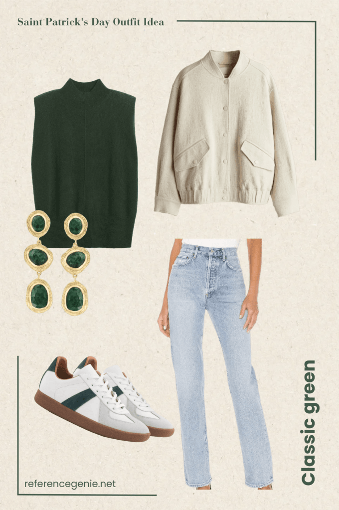 1. **Classic Green Ensemble** When in doubt, go green! Opt for a classic green sweater paired with your favourite jeans for a laid-back yet stylish look. Not only will you be honouring the tradition of wearing green on Saint Patrick’s Day, but you’ll also exude effortless charm. I added a pair of sneakers with splash of green and a bone coloured jacket to finish the look. These gorgeous Ross Simons earrings top the look and add the classic touch we all love!