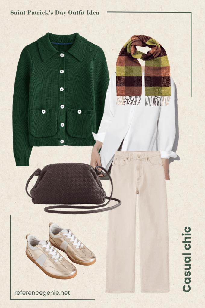 2. **Casual chic look** Add a touch of Irish flair to your outfit with a nice Irish pattern piece. This look could also be an outfit to go to work. I LOVE the cardigan-jacket here, in dark green from Sezáne. By layering it with a nice button down shirt and this Irish-inspired scarf, you are ready to rock it! I also want to note the beautiful, Bottega Veneta inspired pouch bag from Quince. It will give you the effortless chic style, in leather as well, but for a great price! And last but not least, the beautiful pair of pants in oat color with the gorgeous pair of sneakers in gold to add an extra spark to the ensemble.