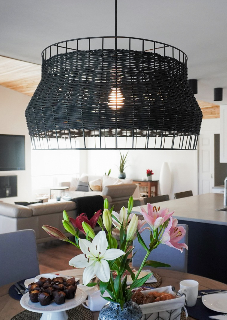 Adding a statement piece above your dining table can truly elevate the entire room and serve as a focal point for any style. We are opting for materials like raffia and metal to bring a harmonious blend of natural and industrial elements. This stunning light pendant not only contrasts with the organic feel of the space but also adds a touch of sophistication. Its design textures perfectly encapsulate the Organic Modern aesthetic.