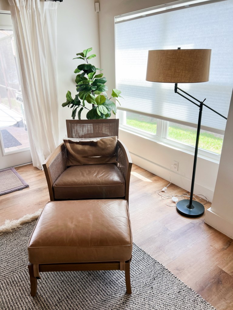 In our living room, the colors and materials chosen let natural light flood in, creating a cozy nook that’s perfect for diving into a good book. With a mix of textures like the soft rug and smooth wood floor, plus the contrast of the leather chair and linen blind, the space feels both sophisticated and relaxed. And when the sun sets, the sleek floor lamp design sets the mood for a relaxing read. Plus, a little greenery from a potted plant ties everything together, bringing a breath of fresh air to the room.
