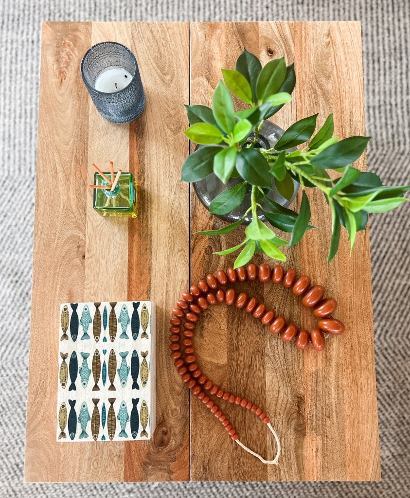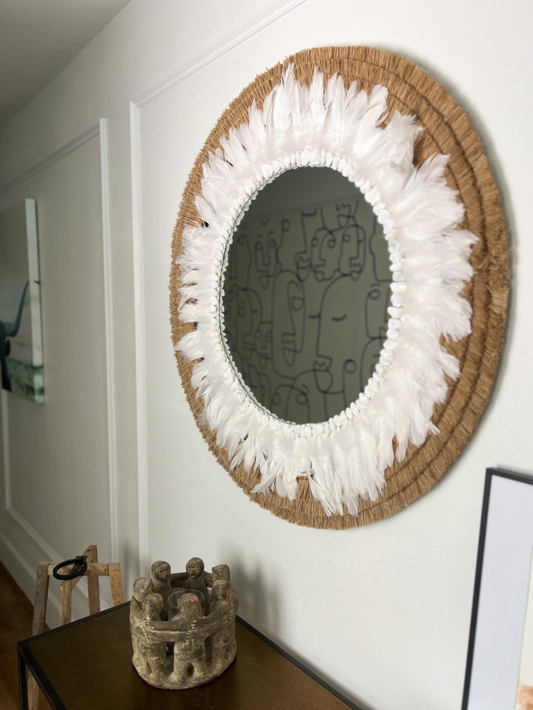 Mirrors hold a special place in my heart as one of my favourite decor pieces, and my mom’s craftiness truly shines with the stunning creation hanging in our entrance. I love the tribal-inspired vibe enhanced by the delicate white feathers, perfectly complemented by the tropical touch of the raffia border. Not only does it make a bold statement, but it also elevates the ambiance of our front foyer, welcoming guests with its unique charm and artistic flair.