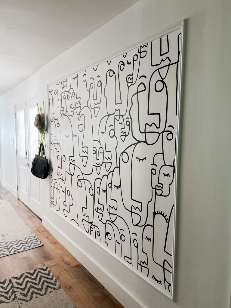 To conclude our series, let’s talk about the modern art panel in our hallway. My mom creatively transformed one of the boiserie areas in our hallway into a stunning art display. Within the space, she curated a captivating piece of minimalistic art wallpaper in black and white. This addition not only adds depth and dimensionality to the hallway but also elevates the entire space, adding a contemporary flair that leaves a lasting impression. The curves and soft edges on the drawing add to the Organic Modern aesthetic of out home.