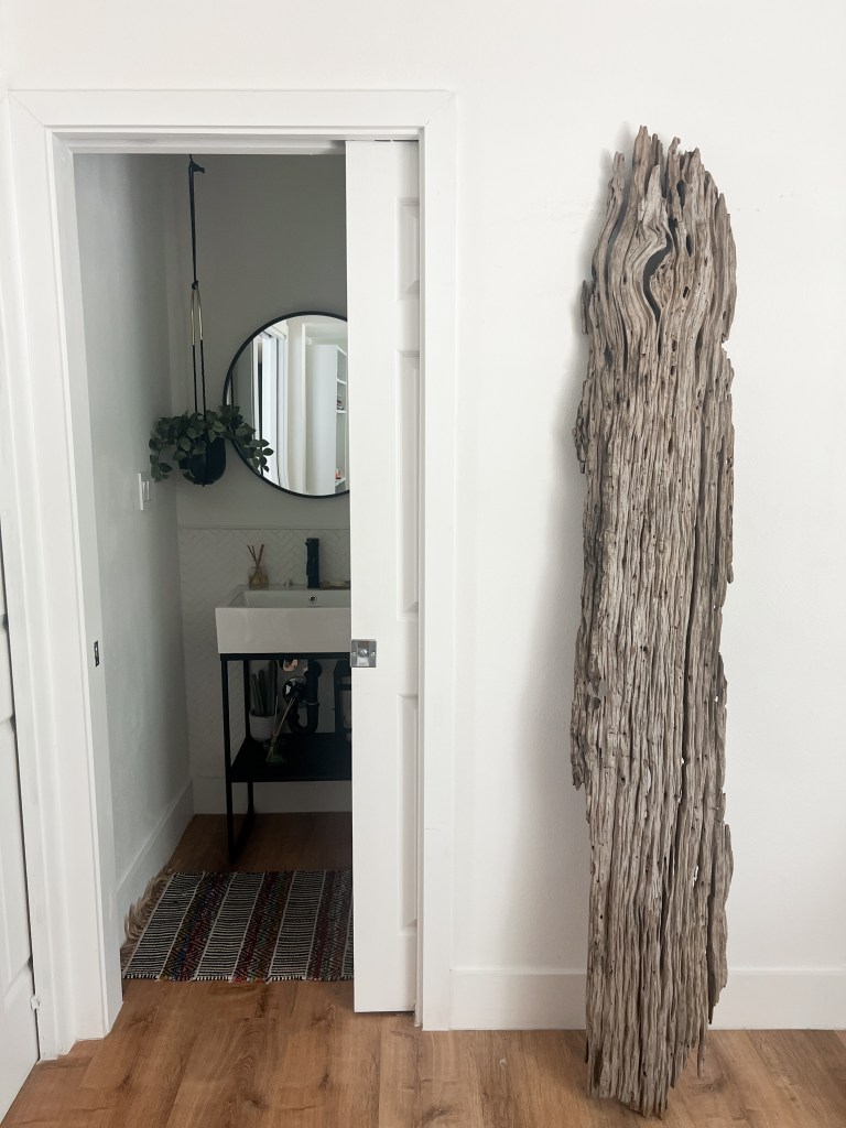 Every time I step into our office space and catch sight of the large piece of wood my mom found at an antique market near Orlando, I’m struck by its uniqueness and the statement it makes. It’s like bringing a piece of raw nature right into our home, adding a touch of sophistication and an art gallery vibe to the room. Its modern aesthetic and artistic presence truly elevate the space, making it a focal point that never fails to impress.