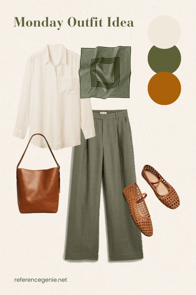 Step into Monday with effortless sophistication in linen sage green pants paired with a crisp white linen shirt. Elevate the look with a touch of vibrancy by adorning a lush green silk scarf, adding a pop of color and texture. Complete the ensemble with caramel raffia leather flats and tote, exuding understated elegance and practicality for a busy day ahead. This ensemble seamlessly combines comfort with style, ensuring you start your week on the right note.
