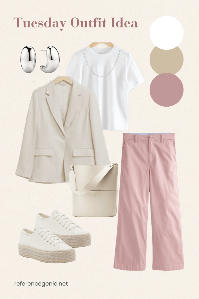 Embrace Tuesday with a casual chic look that effortlessly transitions from a day in the office to a day touristing around. Slip into a pair of stylish straight jeans in pastel rose, embracing the subtle charm and femininity. Layer a crisp white tee underneath a natural color linen blazer for a polished yet relaxed vibe, perfect for any professional or casual setting. Complete the outfit with white raffia shoes and a matching white leather tote, adding a touch of summery elegance to your outfit. Elevate the look with a hint of luxury by accessorizing with delicate white gold or silver jewelry, adding a subtle sparkle to your outfit aesthetic. This ensemble strikes the perfect balance between comfort, style, and sophistication, ensuring you navigate your Spring Tuesday with confidence and flair.