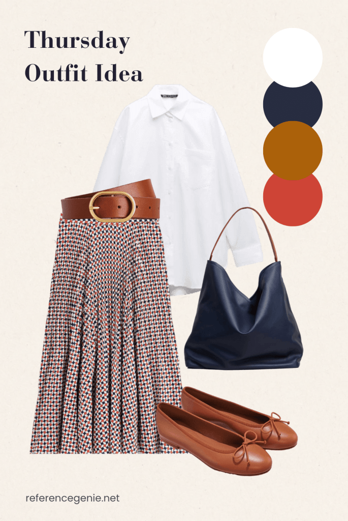 As Thursday arrives, add to your spring wardrobe warmth and sophistication with a rich color palette ensemble. Let your outfit revolve around a stunning patterned mid-skirt, with hues of reddish-orange and navy blue, serving as the focal point of your outfit. For a polished yet feminine touch, pair the skirt with your favorite white shirt and cinch it at the waist with a wide caramel leather belt, adding an element of sophistication and structure to the ensemble. Complete the look with caramel ballerina flats and a navy blue leather tote, effortlessly tying together the colors of the belt and skirt for a coordinated finish. Embrace the transition into the weekend with this chic and versatile outfit, perfect for both professional settings and casual outings.