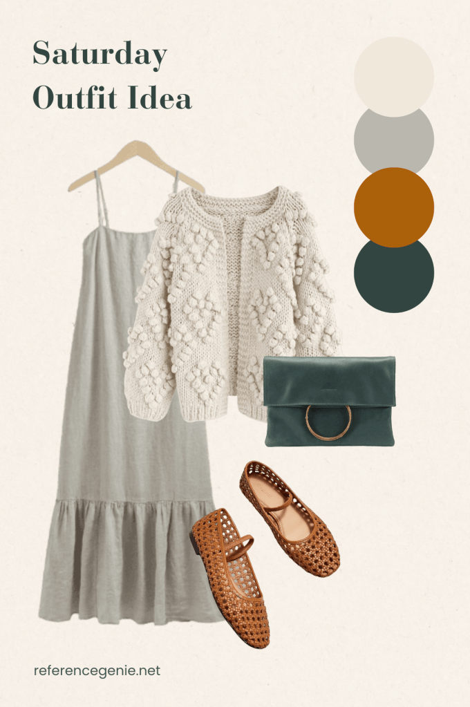 As Saturday arrives, so does cute outings with friends, including brunch. Bringing romantic and feminine energy into the day, we will start with a light sage green midi dress.To enhance the delicate aesthetic, layer on a cotton knitted cardigan in soothing beige hues, adding a hint of romance while keeping you cozy against the spring breeze. Complete the ensemble with cute caramel flats for a touch of sweetness and comfort, allowing you to wander and explore the city with ease. Add a finishing touch of sophistication with a nicely clutch in navy aqua green, injecting a subtle pop of color to elevate the overall look.
