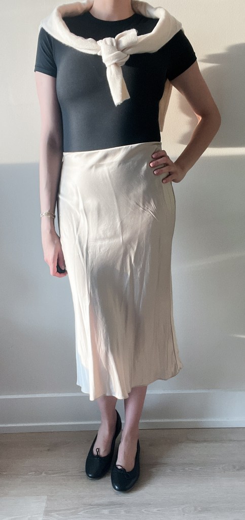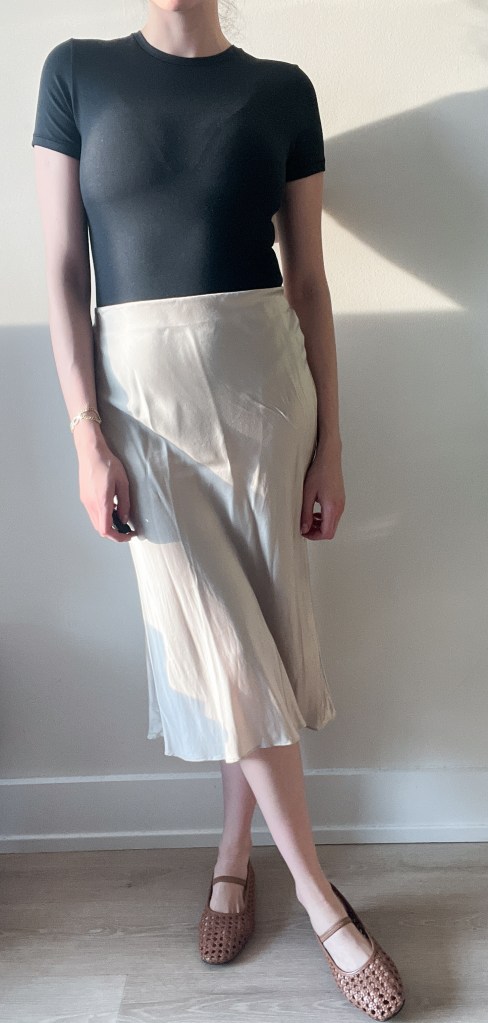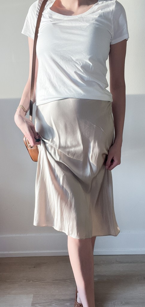 Silk slip skirts are all about effortless charm and versatility. Made from luxurious silk fabric, they offer a sleek and silky-smooth feel that’s as comfortable as it is stylish. These skirts are perfect for any occasion, whether you’re dressing up for a night out or keeping it casual during the day. With their simple yet chic design, they effortlessly elevate any outfit. I love seeing woman mix and match this wardrobe piece with sneakers, flats or heels. For the girlies looking for capsule wardrobe clothing ideas, the versatility of this skirt makes it an unique piece for a capsule wardrobe.